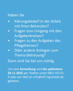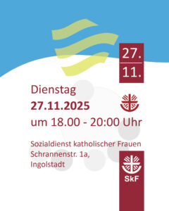 SkF Gesamtverein fordert: Finanzielles Aus der Allgemeinen Sozialberatung verhindern21.10.2025Caritas, SkF und SKM appellieren an Politik und Kirche: Der unverzichtbare Lotsendienst darf nicht schließen – Auch der SkF Ingolstadt unterstützt diesen Appell und weist auf die eigenen Beratungsangebote hin. Mainz, 16. Oktober 2025. Unter dem Motto „Türen offen halten: Allgemeine Sozialberatung sichern“ eröffnen der Deutsche Caritasverband, sowie die Caritas-Fachverbände SkF Gesamtverein und der SKM […]
