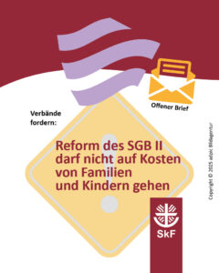 Offener Brief: Verbände fordern Reform des SGB II darf nicht auf Kosten von Familien und Kindern gehen26.02.2026Ein breites Bündnis aus 38 Organisationen und Verbänden, darunter auch der SkF, wendet sich in einem Offenen Brief an die Bundesregierung und die Fraktionen im Bundestag. Wir geben hier die Stellungnahme des SkF-Gesamtvereines wieder: Die Unterzeichnenden fordern geplante Verschärfungen bei der Reform der Grundsicherung (SGB II) zurückzunehmen, die insbesondere Familien mit Kindern treffen. Die Reform […]