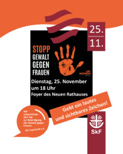 STOPP GEWALT GEGEN FRAUEN24.11.2025Dienstag, 25.November 2025 um 18 Uhr Foyer des neuen Rathaus Ingolstadt Gebt ein lautes und sichtbares Zeichen! Wir unterstützen den Tag zur Beendigung der Gewalt gegen Frauen. In Deutschland… In Ingolstadt wurden im Jahr 2024 allein 302 weibliche Opfer häuslicher Gewalt (angezeigte Fälle, Statistik für Stadt Ingolstadt/Polizeipräsidium Oberbayern Nord) und ein versuchter Tötungsdelikt erfasst. Ingolstadt […]
