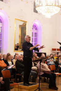 Den ersten Teil des Konzerts gestaltete der Projektchor „Schambacher Nachsommerklang“, bestehend aus 13 Choristen und geleitet von Stefan Grosch. Hier durfte das Publikum einen Gang durch mehrere Jahrhunderte antreten. So waren im Programm etwa Bachs „Was Gott tut, das ist wohlgetan“, verschiedene Volksliedbearbeitungen aus dem 19. und 20. Jahrhundert ebenso vertreten wie Immo Schröders „As Time Goes By“ von 2023. Auch „Hymne à la nuit“ von Rameau durfte nicht fehlen, vielen sicherlich aus dem Film „Die Kinder des Monsieur Matthieu“ bekannt. Allen Beiträgen war ein Bezug zum Thema Zeit gemein, seien es Tages-, Jahres- oder Lebenszeiten. Grosch dirigierte das Ensemble sicher bei den teils recht anspruchsvollen Sätzen.