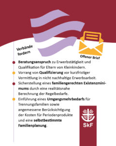 „Statt zu sanktionieren, wäre es gerade jetzt wichtig im SGB II und darüber hinaus mehr Mittel dafür einzusetzen, Frauen mit Sorgeverantwortung für Kinder in Erwerbsarbeit zu integrieren. Viele erleben hier hohe Hürden am Arbeitsmarkt und bräuchten eine langfristige individuelle Unterstützung, um auf dem Arbeitsmarkt Fuß zu fassen. Für entsprechende Beratung und Begleitung fehlen jedoch die Mittel“, so Yvonne Fritz, Vorständin des SkF Gesamtvereins.
