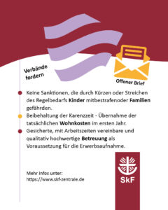 Jede dritte Bedarfsgemeinschaft sei eine Familie mit minderjährigen Kindern, betonen die Unterzeichnenden. Sanktionen blieben daher nicht auf einzelne Personen begrenzt, sondern träfen unmittelbar auch Schutzbefohlene und Partner:innen. Der Offene Brief fordert unter anderem den Verzicht auf Sanktionen, die Kinder mitbestrafen, die Beibehaltung der Karenzzeit für Wohnkosten sowie eine realitätsnahe Berechnung der Regelbedarfe.