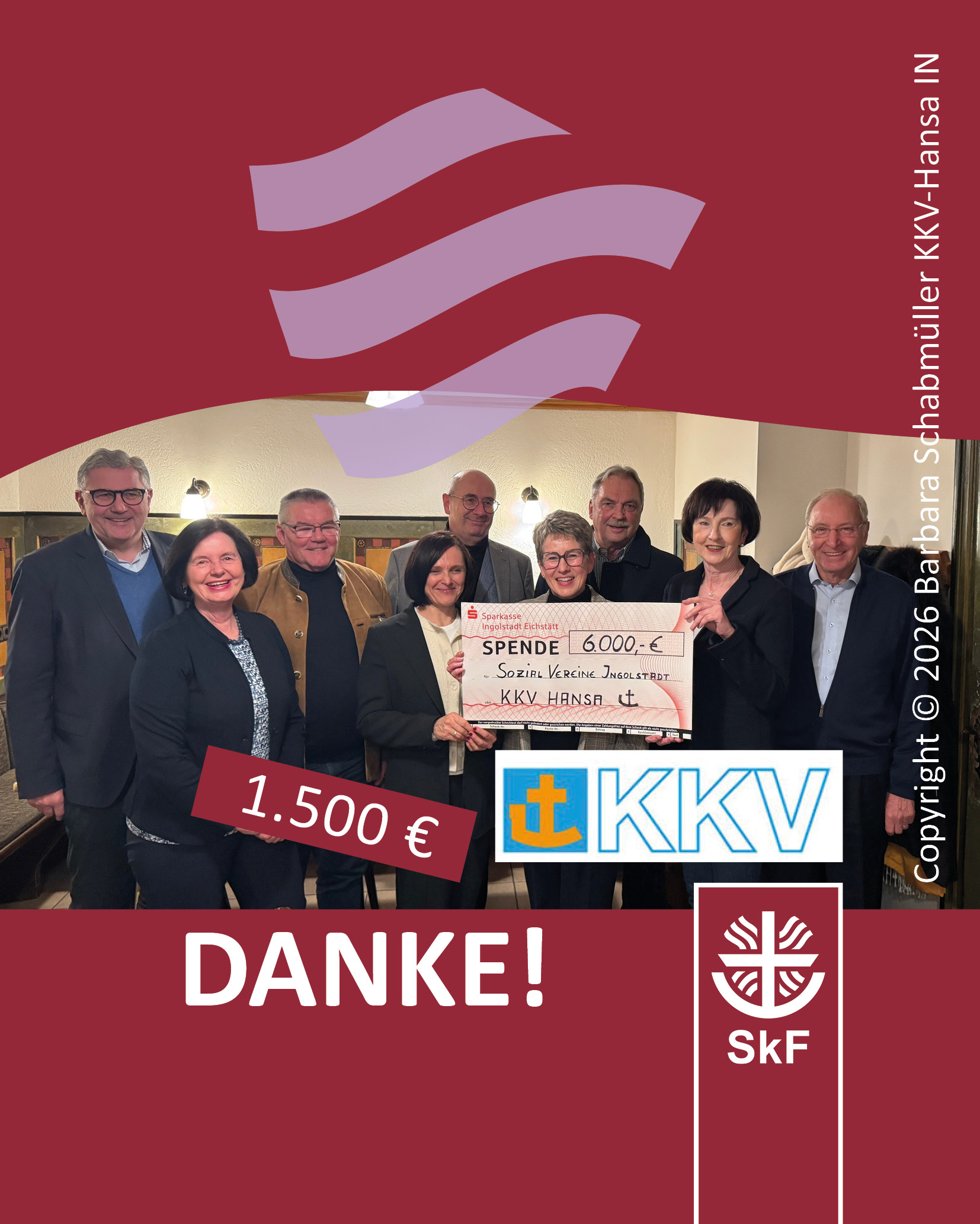 Die Ortsgemeinschaft Ingolstadt des KKV-Hansa (Verband der Katholiken in Wirtschaft und Verwaltung) hat auch zu Beginn dieses Jahres Spenden an gemeinnützige Einrichtungen verteilt. Von den insgesamt 6.000 € gingen diesmal 1.500 € an den SkF Ingolstadt.