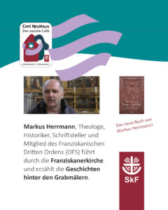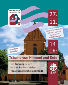 Träume von Himmel und Erde – Eine Führung zu den Grabdenkmälern in der Franziskanerkirche IngolstadtReferent /-in: Markus Herrmann, Theologe, Historiker, Schriftsteller und Mitglied des Franziskanischen Dritten Ordens (OFS) Adresse: Schrannenstr. 1a, 85049 Ingolstadt, Multifunktionsraum Bereich: |