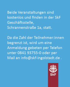 Beide Veranstaltungen sind kostenlos und finden in der SkF Geschäftsstelle, Schrannenstraße 1a, statt.